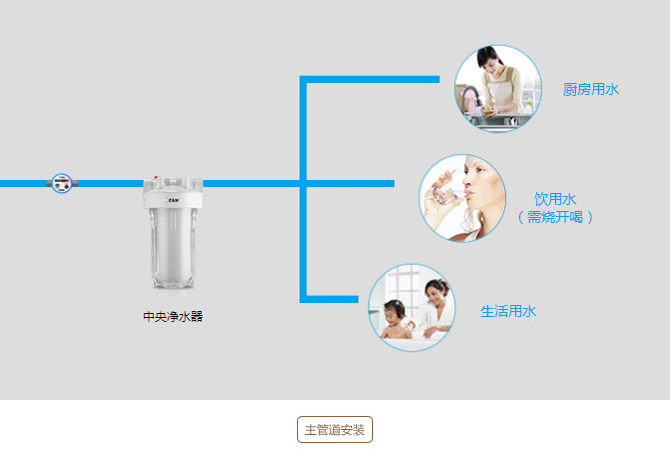 >安装在入户主管道,净化家庭100%用水(饮用水+厨房用水+生活用水),厨房可用上净化过的热水。缺点:家庭10%的饮用水过滤精度不高(只去除了颗粒杂质和余氯、部分化合物和重金属),必须要烧开饮用。