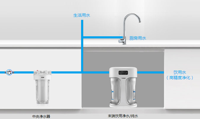 前置过滤器+中央净水器 + 末端饮用净水器/纯水机