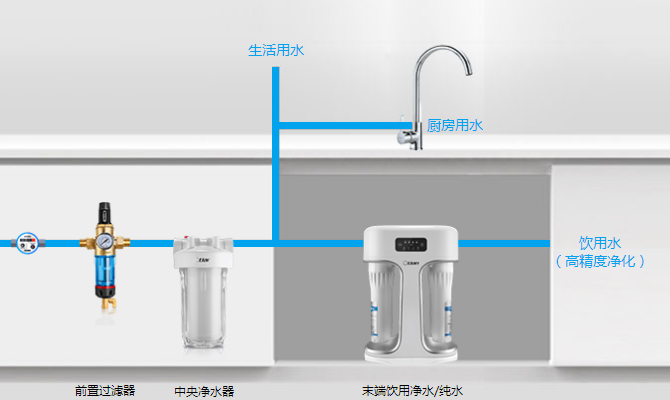 前置过滤器+中央净水器+末端饮用净水器/纯水机+管线饮水机