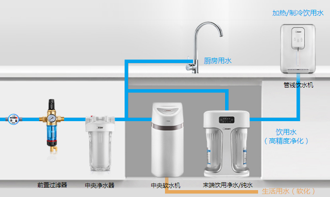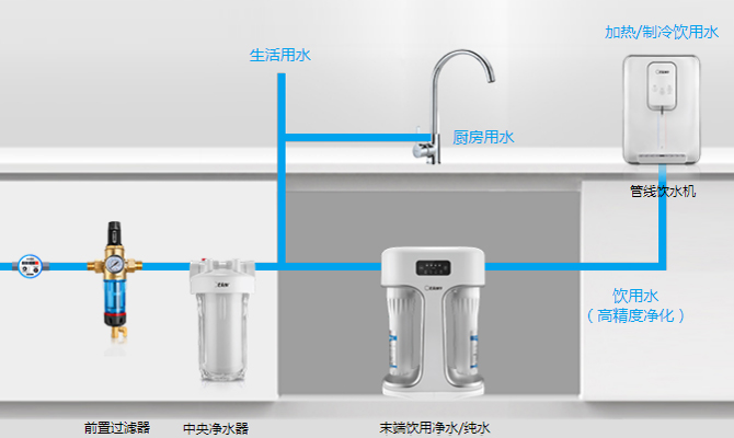 前置过滤器+中央净水器+管线饮水机+末端饮用净水器/纯水机+管线饮水机